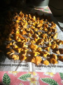 Although we need more rain, I did manage to find about a pound and a half of chanterelles this weekend. Now it’s still so dry that there weren’t very many but mushroom hunting was cut short by the very dramatic collapse of one small dog. Granted, he has no achilles tendon on one side and wears an orthotic, but he went full tilt until we were about a mile away from the car, then sat down, panting, and wanted to be carried back. After a refreshing cooling off period in a creek, we walked, very slowly, and very limpily back to the car. He got limpier still when sympathetic people passed him on the trail. So much so, that one guy in his 20s, with a toddler in a backpack, offered to carry him. Oh Owie! Have some pride!