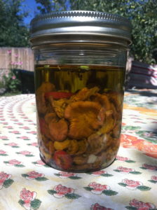Anyhow, we did score a nice little haul of chanterelles, and I experimented with the Fungi all Olio recipe from My Calabria: Rustic Family Cooking from Italy’s Undiscovered South. This is one of my favorite cookbooks I reviewed last year, and while I did her green tomatoes preserved in oil, by the time I got the book, the mushroom season was over. The green tomatoes were so delicious that I’ve been waiting all year to do mushrooms. In short, the method works like so: you salt the item you’re preserving, in this case the chanterelles, then boil them in vinegar for about five minutes, then dry them overnight on towels. What you want is for the surface to be a little tacky, but not leathery. Then you chop up some garlic and aromatics (I used chiles and summer savory) and submerge it all in olive oil. As you can see below, the chanterelles shrunk up a lot, I wound up with just over half a pint. (I also kept about a cup or so out for cooking fresh.)
